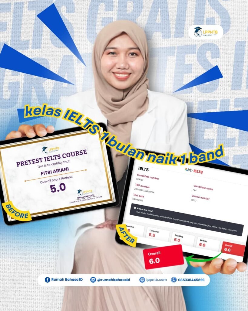 Hal tersebut juga dirasakan oleh Kak Fitri yang baru-baru ini menyelesaikan kursus IELTS di Rumah Bahasa ID by LPPNTB. Score awal Kak Fitri sebelum kelas dimulai di band 5.0 dan setelah menyelesaikan kursus, Kak Fitri berhasil mendapatkan band score 6.0 untuk official test IELTS.
